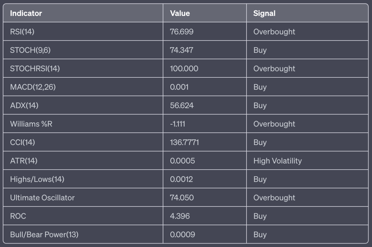 - ATR(14): The Average True Range is 0.0005, indicating high volatility. The ATR is a technical analysis indicator that measures market volatility by decomposing the entire range of an asset price for that period.
