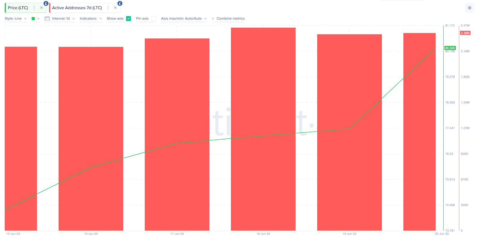The chart below shows how Litecoin DAU (7d) has increased from 2.2 million on June 15 to 2.45 million addresses recorded on June 20.