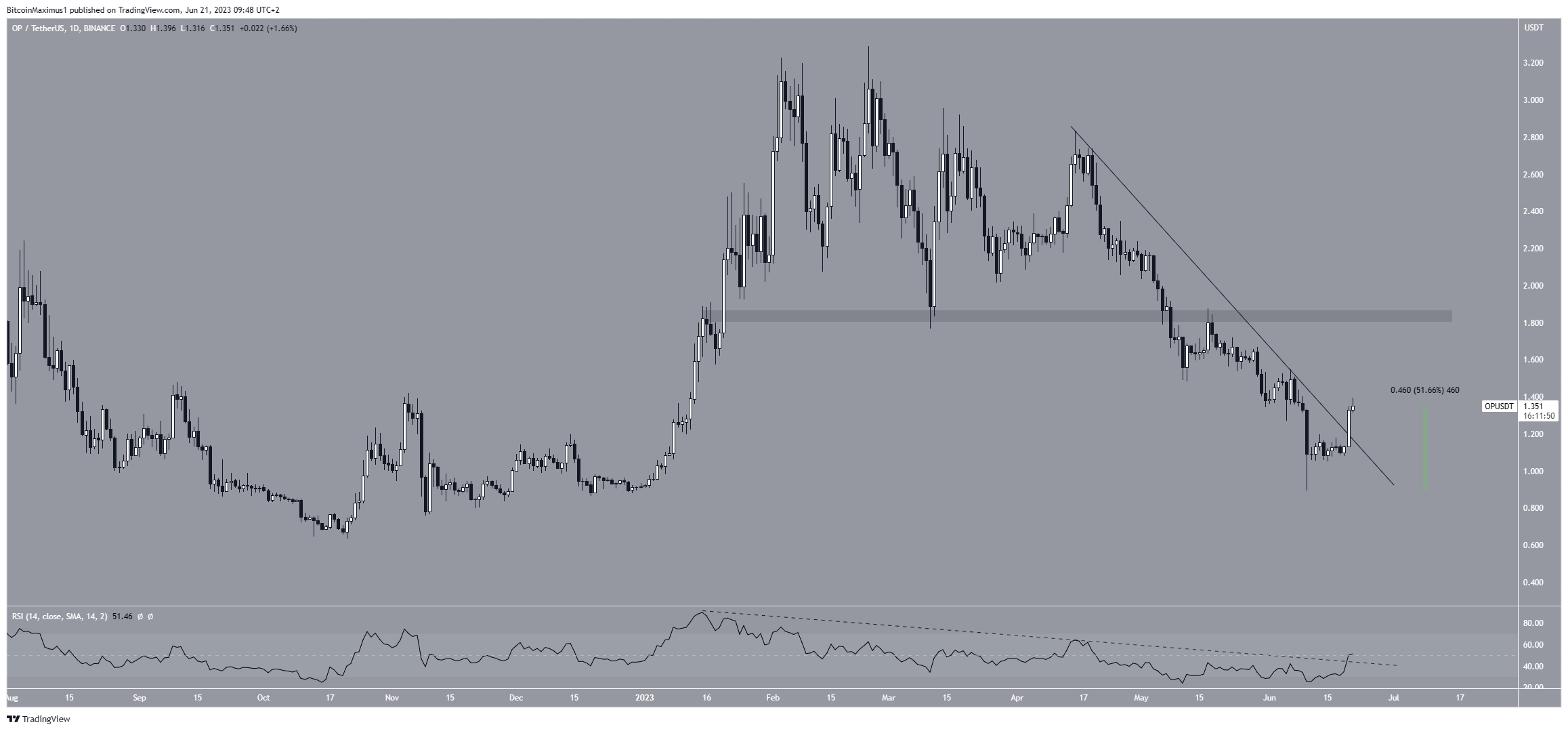 The OP Price has decreased under a descending resistance line since the end of April. The drop led to a low of $0.89 on June 10. This was a new yearly low. However, the price has recovered since, bouncing by 51%.
