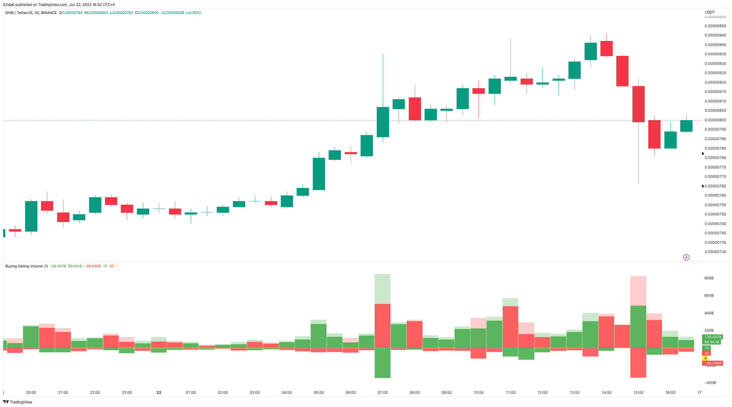 The preceding half hour also witnessed a flurry of activity, resulting in a total hour-long decline of 4% in price, with a whopping 800 billion tokens offloaded. The indicator further disclosed that the buying volume on Binance during this period accounted for nearly half of the selling volume, reaching approximately 412.44 billion SHIB.