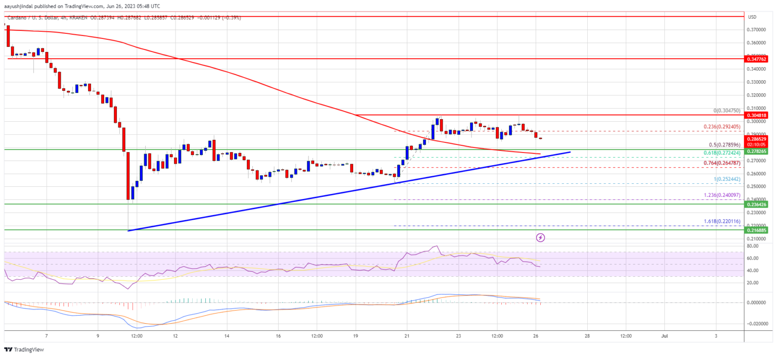 ADA is now trading above $0.275 and the 100 simple moving average (4 hours). There is also a key bullish trend line forming with support near $0.2780 on the 4-hour chart of the ADA/USD pair.