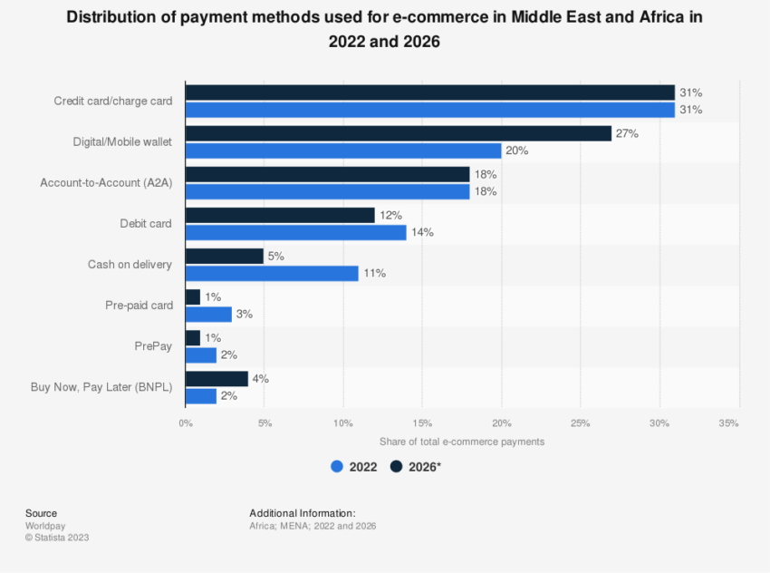 In the MENA region, this shift in consumer behavior is particularly noticeable. The rapid decline of cash usage, from 26% in 2019 to 16% in 2022, signifies the momentum of digital payment adoption.