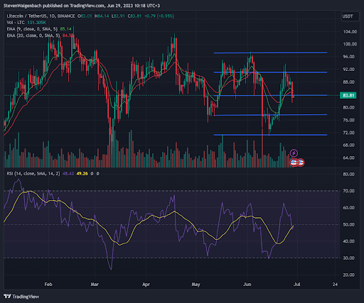 If the 9-day EMA line crosses below the 20-day EMA line, it will signal that LTC’s price has entered into a short-term bearish cycle and its price would continue to drop in the next few days. Should this happen, the bullish thesis will be invalidated and LTC’s price may fall to the previously-mentioned $71.19 in the following 48 hours.