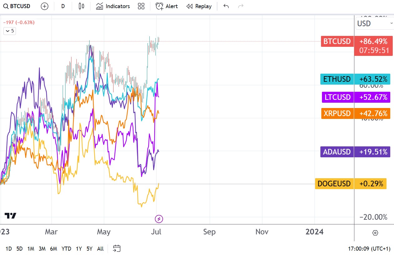 Not all currencies performed like Bitcoin, though. For instance, Dogecoin is flat on the year, up by about +0.3% in the first six months of 2023. This is a huge divergence from what Bitcoin and other cryptocurrencies did (e.g., Ethereum, Litecoin, Ripple), and it reflects the crypto investors’ concentration in a few cryptocurrencies.