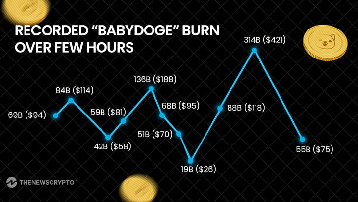 So far, over the last 24 hours, it is reported that a certain set of BABYDOGE burn happened. The most worthiest BABYDOGE burn is accounted to be 136,297,352,058 worth nearly $188 and the highest of all is 314,729,120,128 worth approximately $421.