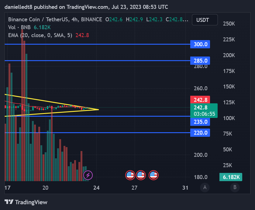 If buyers manage to push the price above the triangle, BNB’s price could ascend to the next resistance at $285. This resistance is crucial to monitor as surpassing it could pave a way for a potential surge to $300.