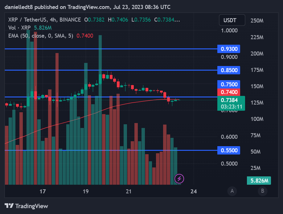 Short-term bulls attempted to cash in some of their profits over the past 24 hours, However, this profit taking attracted aggressive selling pressure from bears as they started opening multiple sell positions. This selling pressure resulted in XRP’s price falling to the 50 EMA line at $0.74.