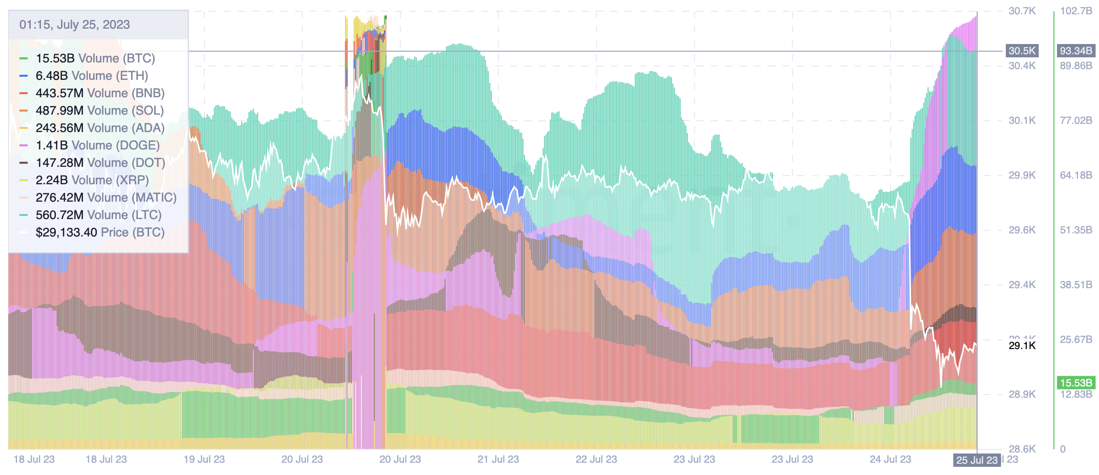 Prominent crypto intelligence portal Santiment has reported a surge in interest in Litecoin (LTC) as the highly anticipated Aug. 2 halving approaches. With less than 10 days left until the halving event, LTC's trading volume has seen a staggering 48.5% increase in less than 24 hours, soaring from $377 million to an impressive $560 million.