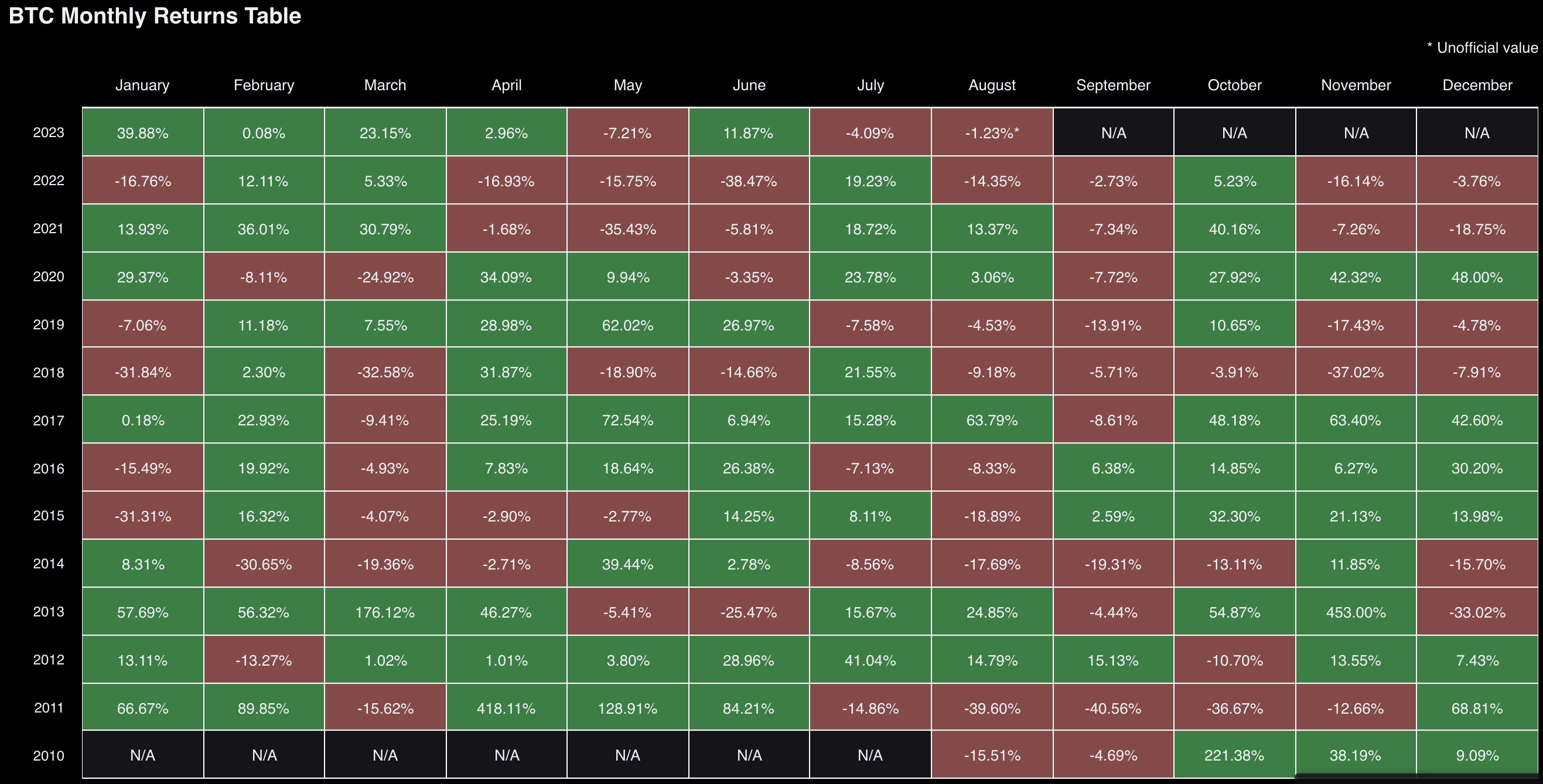 “As I previously mentioned, the ROI of Bitcoin in July of the pre-halving years was -4.74%. The return of BTC in July 2023 ended up being -4.09%. FWIW (for what it’s worth), the average return of BTC in August of its pre-halving years is -21.3%.”