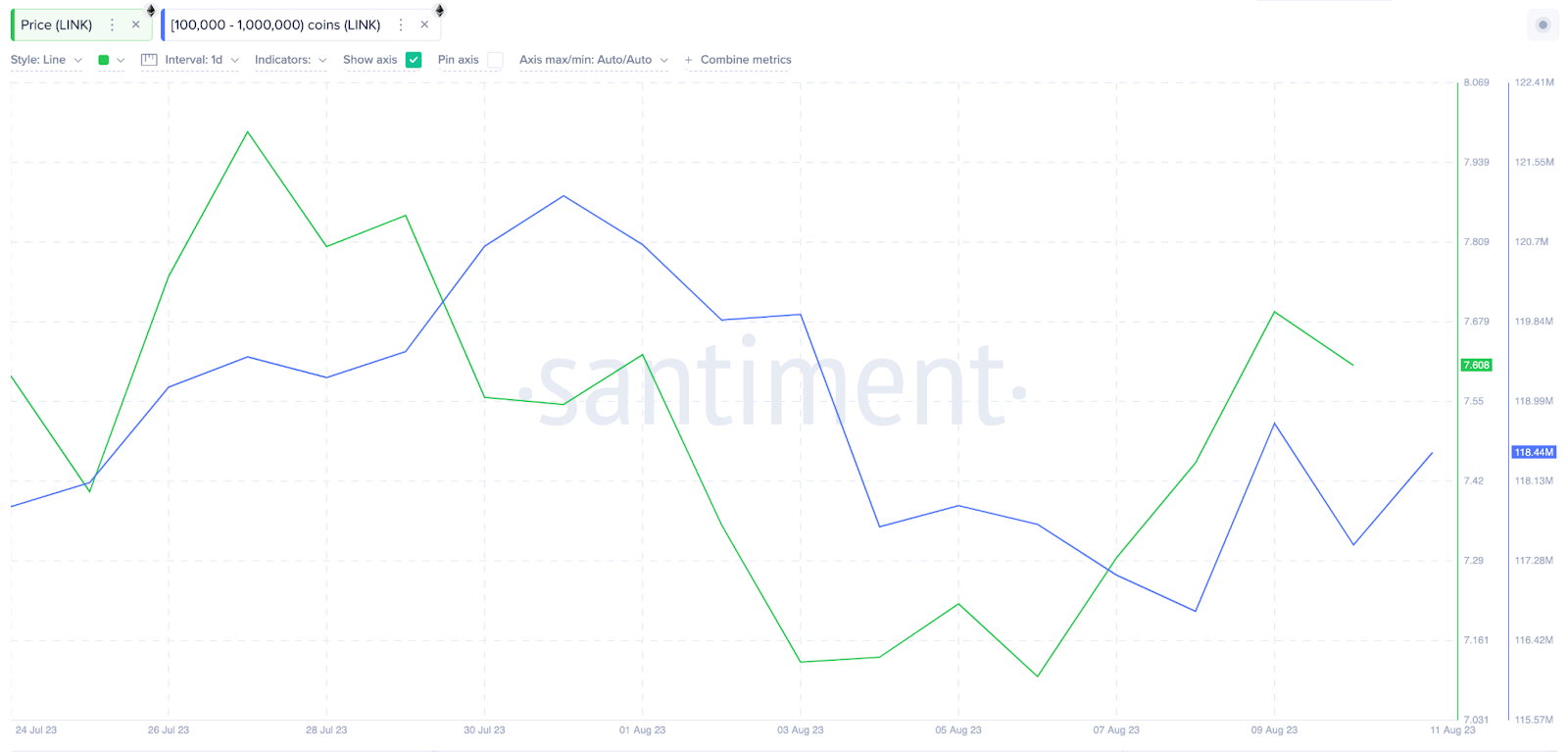 The chart below illustrates the trading activity of crypto whales holding balances of 100,000 to 1 million LINK over the past two weeks. During the first week of August, they had depleted their holdings from 121.9 million to 116.74 million tokens.