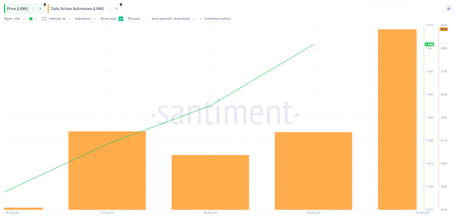 According to Santiment, Chainlink had attracted only 1,666 active addresses on August 6. But by the cost of August 10, it had skyrocketed by 82% to reach 3,033 active wallet addresses.