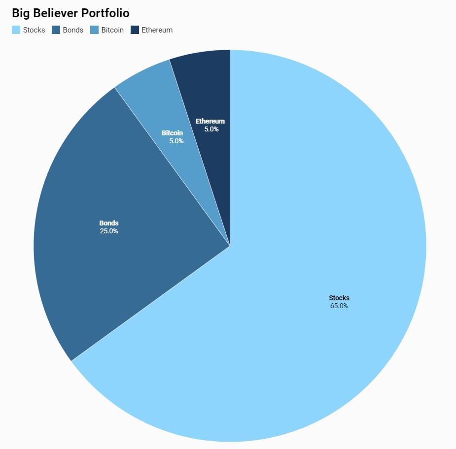 Our philosophy of diversifying across different types of investments (such as gold and crypto) is best represented in our Blockchain Believers Portfolio. This portfolio blends stable assets (typically stocks and bonds) with a mix of reliable crypto investments, which can constitute up to 10% of your total investments. (If preferred, you can replace this crypto allocation with gold.)