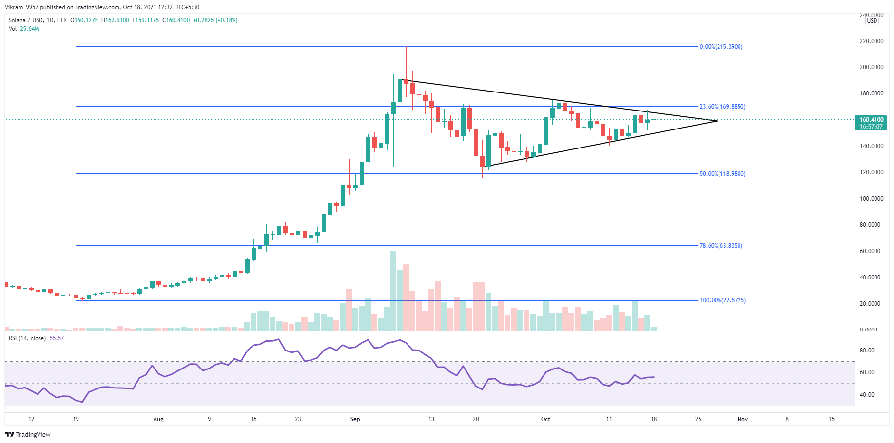 Solana price action projects a symmetrical triangle formation after the solid bull run in the daily chart. Moreover, the price action is making higher lows after finding demand near the 50% Fibonacci Retracement level near $120. Thus, generating the support trend line of the triangle.