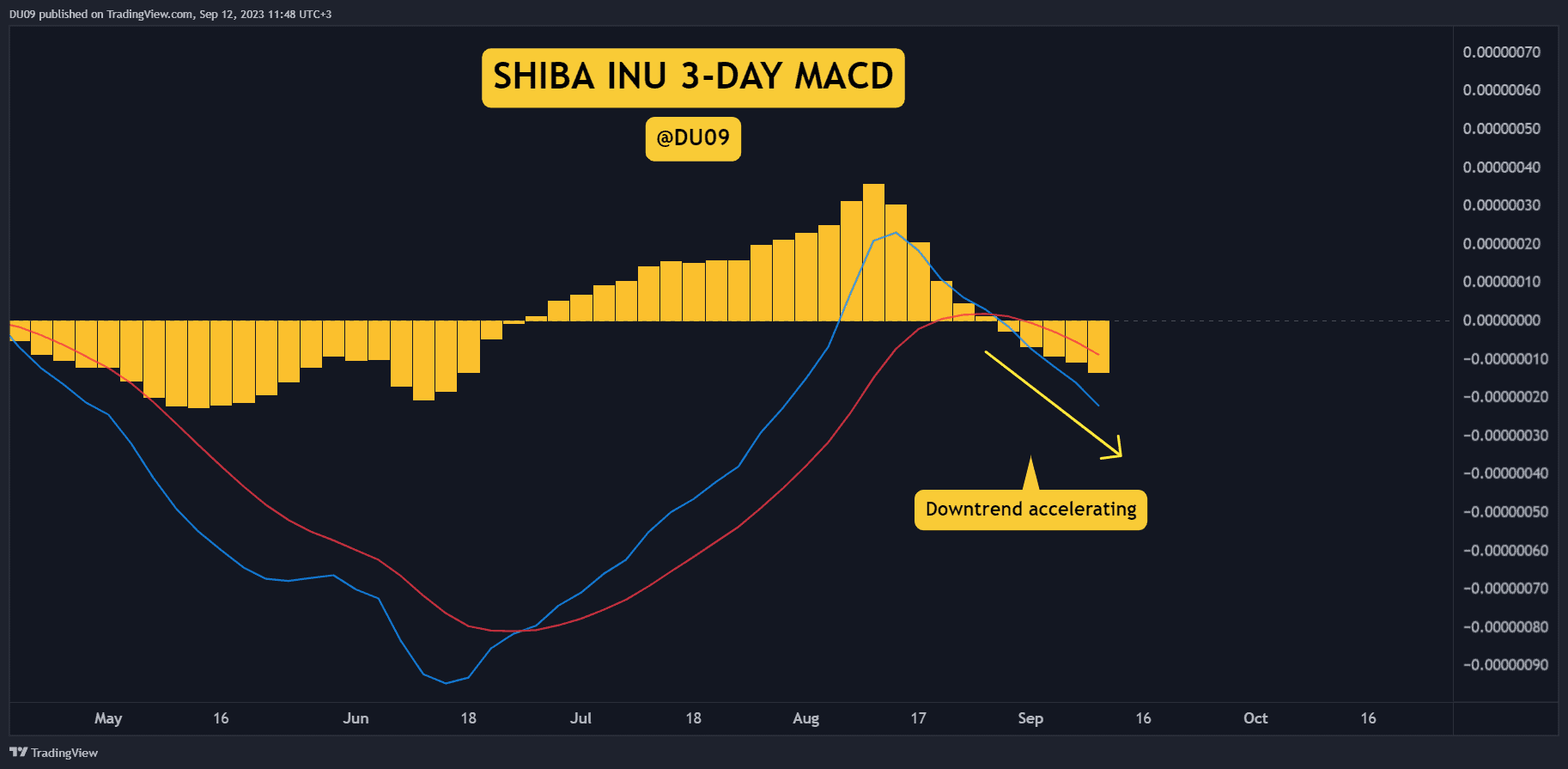 While the daily MACD gave hopes of a possible reversal last week, this was quickly erased as soon as SHIB made a new low. Bearing that in mind, the 3-day MACD is now firmly on the bearish side and accelerating down.
