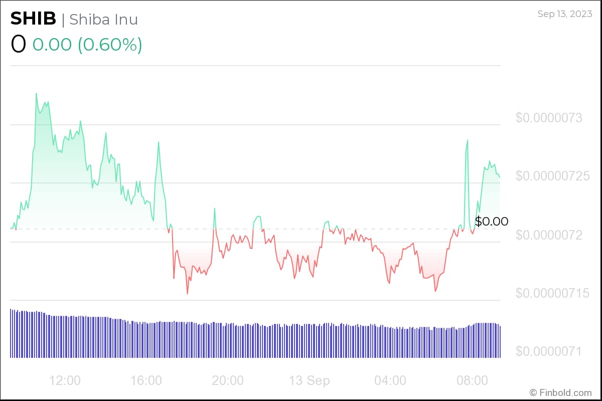 In the current market landscape, Shiba Inu (SHIB) is exchanging hands at a valuation of $0.000007257, marking a modest uptick of 0.77% within the day’s trading, albeit it has encountered a decline of 5.23% over the course of the preceding week.