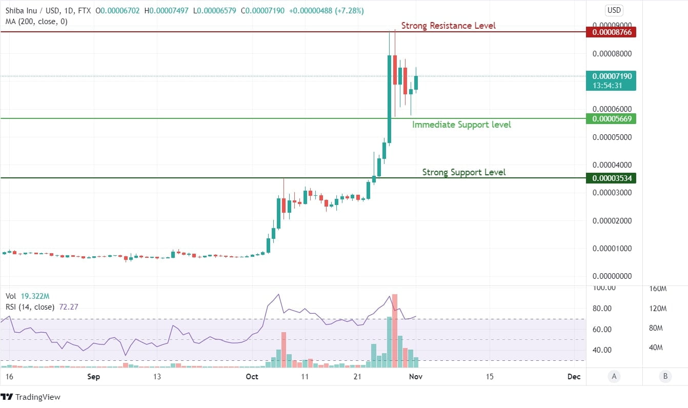 The difference between strong support and resistance is quite significant, and there is an unlikely probability of the prices tumbling down so much to take support from the level of $0.00003534. The breakout candle of October 24 seems to be too strong to fail. IfSupposehe immediate support level fails to stop the profit booking sentiment. In that case, investors will not allow their multi-bagger returns to be at risk and add to the profit booking sentiment.