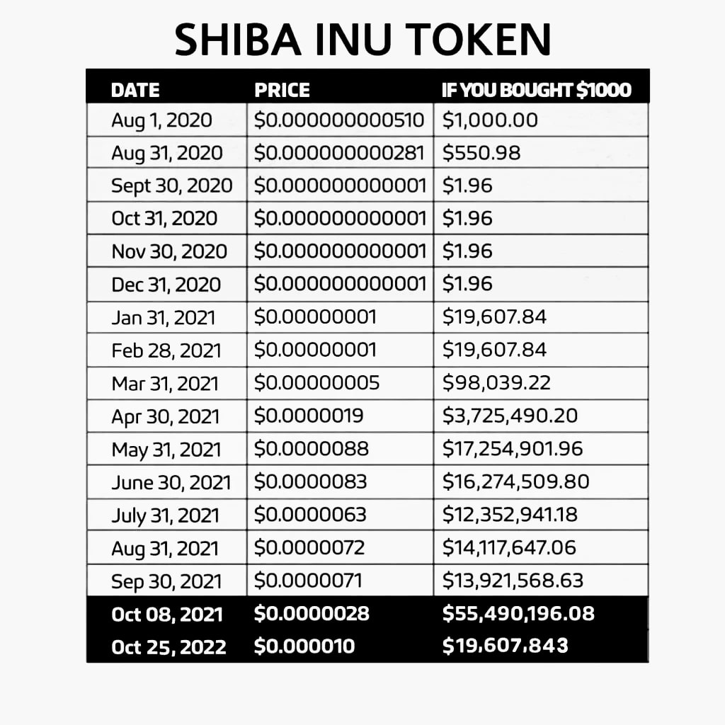 $1,000 invested in Shiba Inu at its earliest trading price of $0.000000000510 procured 1.96 trillion SHIB tokens. When Shiba Inu plummeted to its lowest value of $0.000000000001 later in 2020, the worth of these tokens dropped to $1.96 from Sep 2020 to Dec 2020.