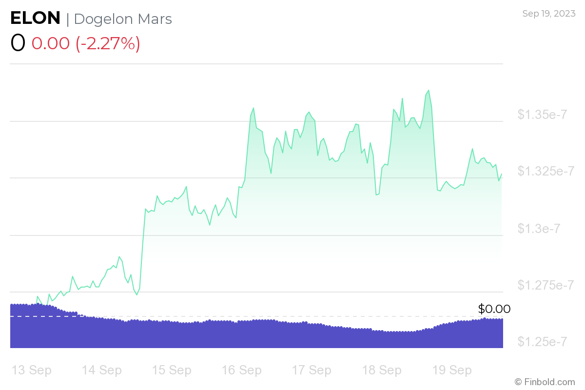 Meanwhile, Dogelon Mars — or just ELON — is trading at $0.0000001341 by press time, with 2.27% losses in the last 24 hours, even in a general bullish market on September 19.