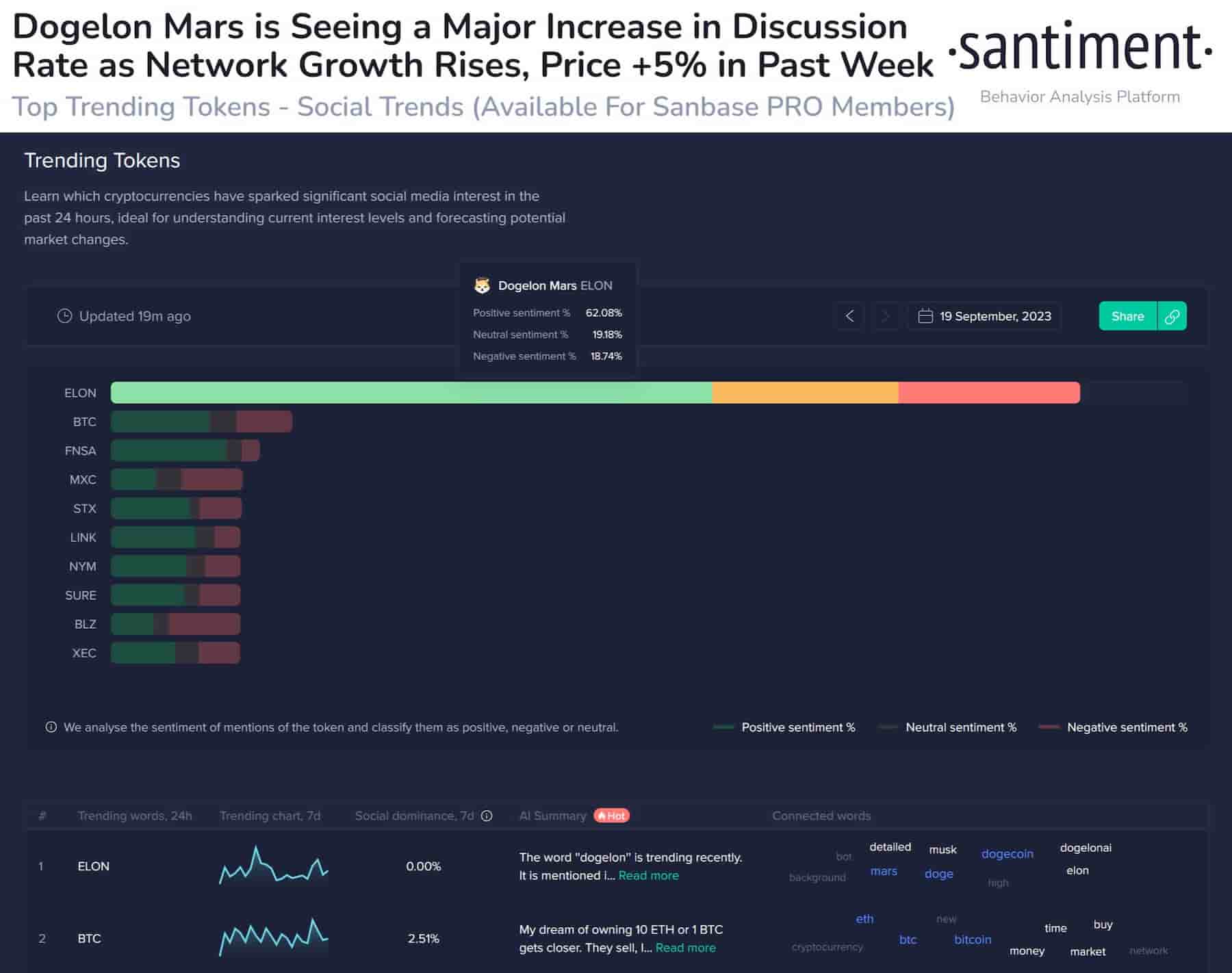 “Dogelon Mars is seeing a major increase in ‘Discussion Rate’ as ‘Network Growth’ rises. Price +5% in the past week.”
