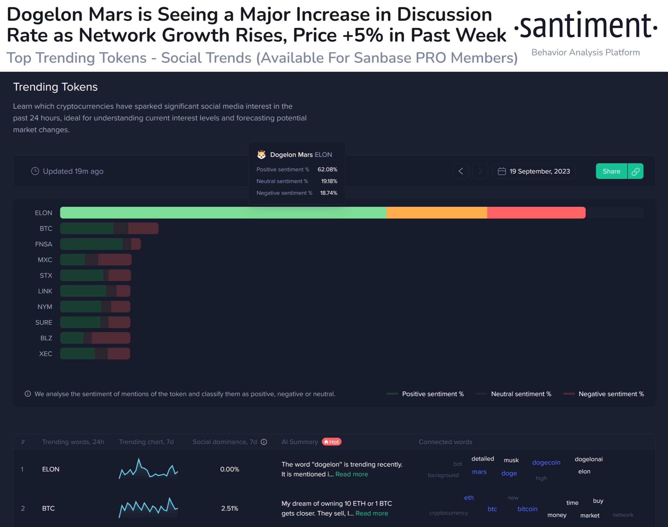 “Dogelon Mars is the fastest rising asset in #crypto, in terms of discussion rate percentage increase. The token has also been seeing recent spikes in network growth, indicating new addresses are being generated at an increased rate,” Santiment analysts posted on X.