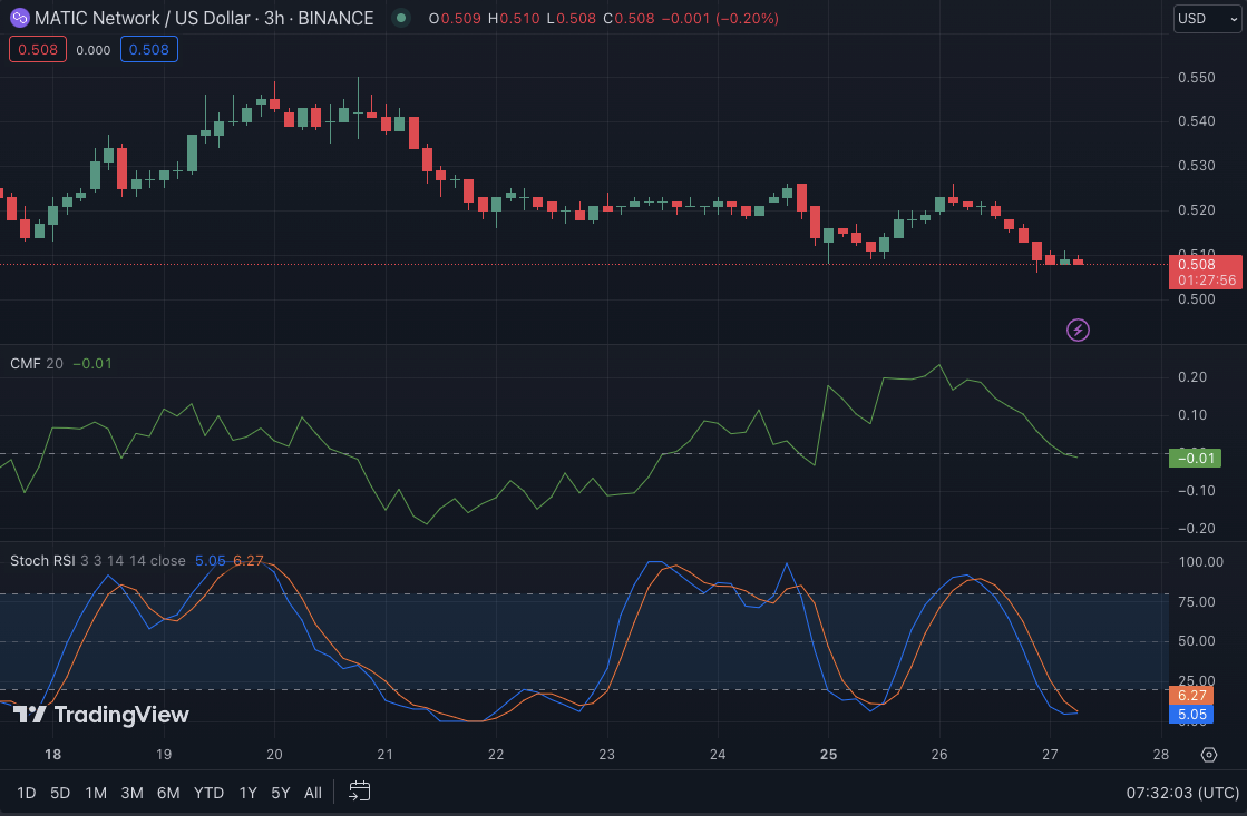 If bearish pressure pushes MATIC below $0.5085, the next support level to watch is around $0.5050. However, a rebound toward the next resistance level at $0.5250 is possible if the market finds positive momentum and breaks above the intraday high of $0.5216.