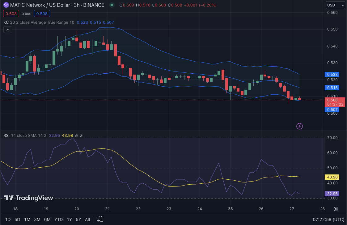 The Polygon (MATIC) market has been in a downtrend for the last 24 hours, with optimistic efforts at a recovery being thwarted at the day’s intraday high of $0.5216. Consequently, pessimism prevailed, and the price dropped to a new 7-day low of $0.5085 before finding support. The MATIC market was still experiencing negative momentum at press time, resulting in a 2.19% drop to $0.5093.