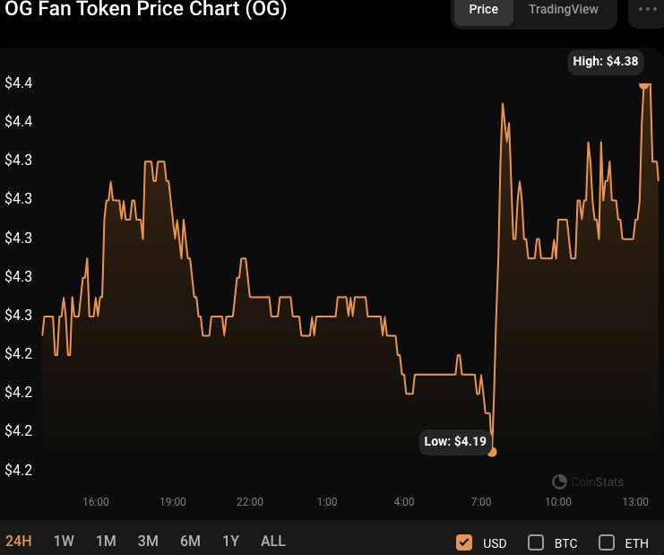Bearish domination has reigned supreme in the OG Fan Token market, lowering the price to a monthly low of $4.24 from a 24-hour high of $4.44. However, as of press time, bulls had overwhelmed bears, with OG trading at $4.38, a 2.85% rise from its intraday low.