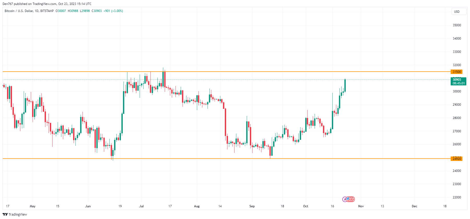 On the daily chart, the price of Bitcoin (BTC) is approaching the resistance level of $31,500. If the bar closes near it, traders may expect continued midterm growth as the main coin has accumulated enough energy for that.