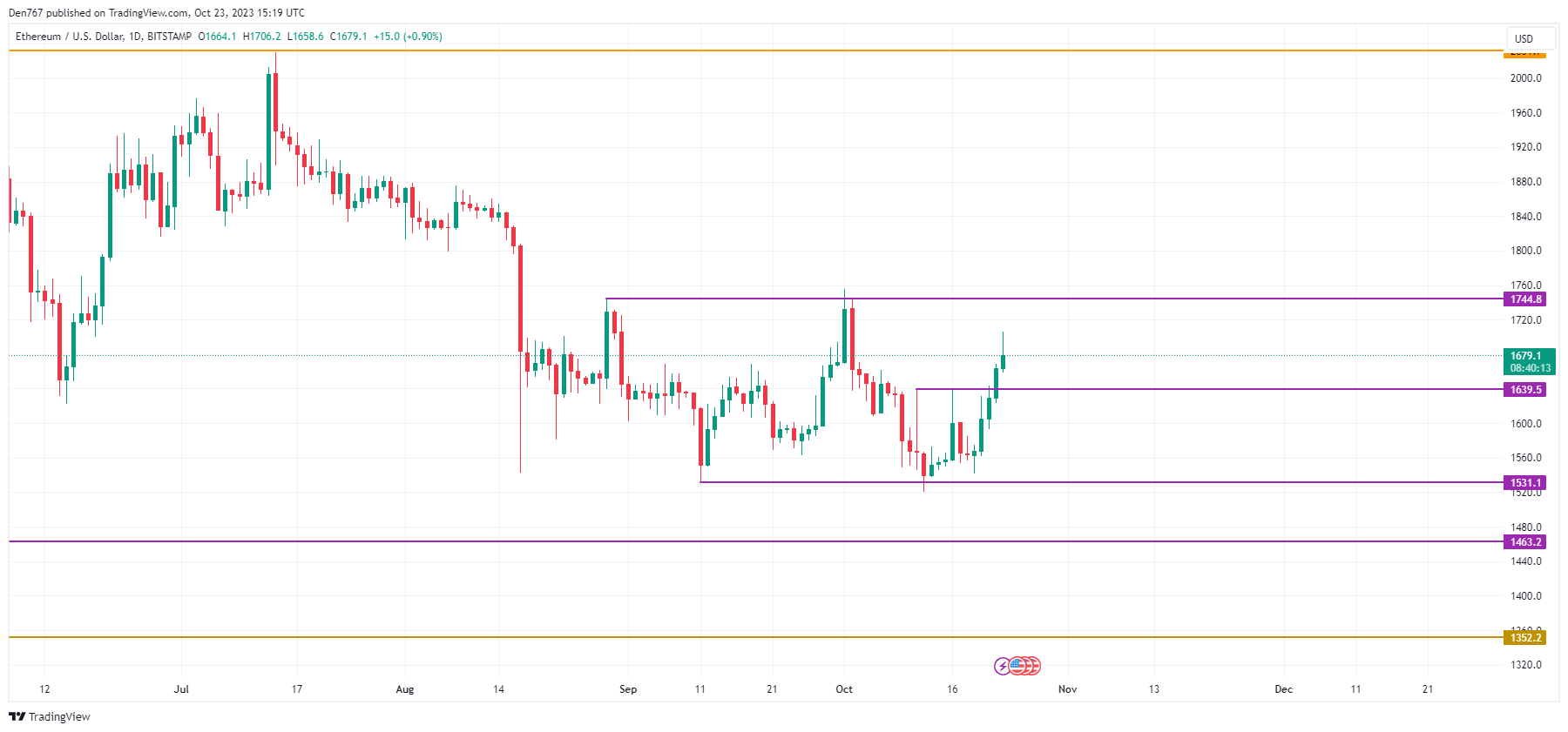 Despite today's rise, the rate of ETH remains in the channel as the price is far from the key levels. If buyers want to seize the initiative, they need to fix above the $1,750 zone.