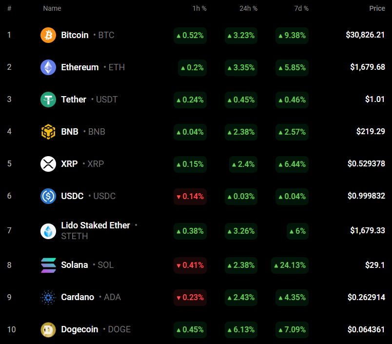 Ethereum (ETH) is the biggest gainer today, going up by 3.35%.