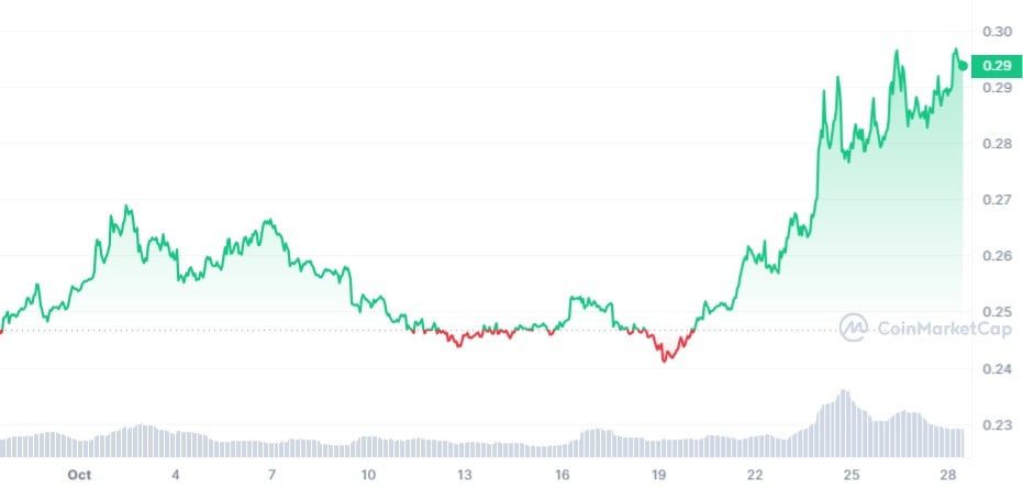 From Cardano's monthly chart as seen above, the token is currently changing hands at its highest price level for the month, having dropped as low as $0.2414 on Oct. 19. This implies that the next crucial level is the resistance level at $0.3, a price point Cardano has not tested since Aug. 10 this year.