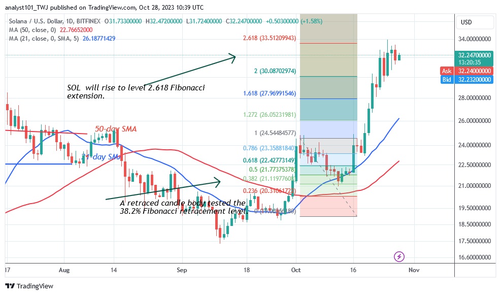 The price of Solana (SOL) maintained its current rise and reached the target price of $33.51. Cryptocurrency price analysis brought by Coinidol.com.