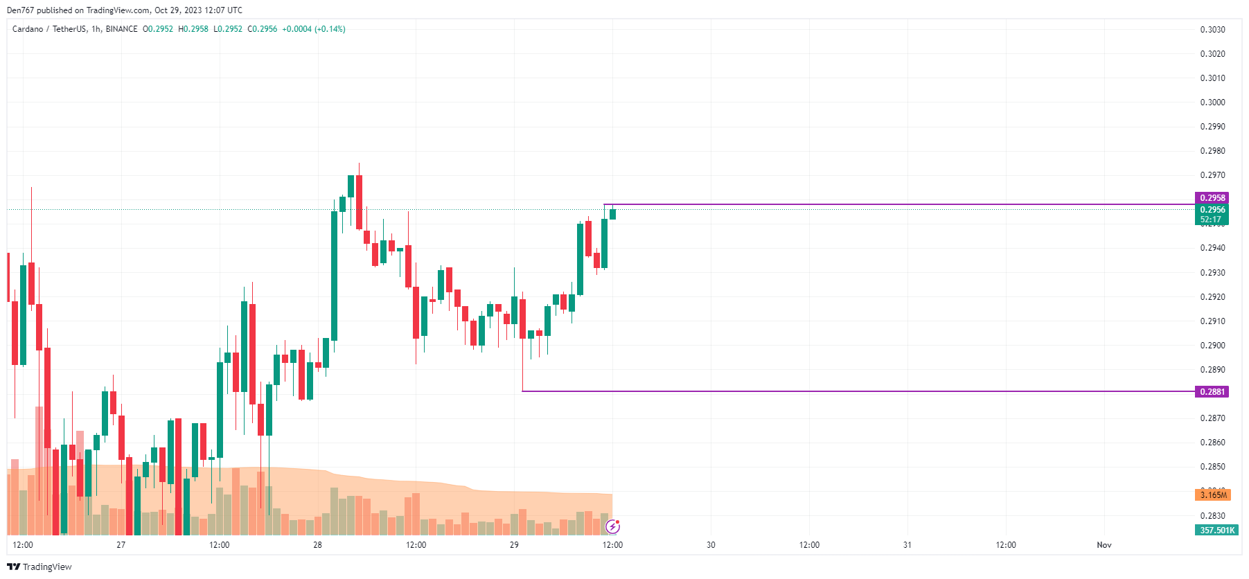 On the hourly time frame, the rate of ADA has set a local resistance of $0.2958. If the daily bar closes around that mark, the breakout may lead to a blast to the $0.30 zone soon.