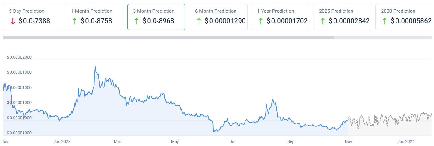 “Based on one price prediction, the average price of $SHIB is estimated to be around $0.00001038 by the end of 2023. However, it’s important to remember that these predictions are based on various factors and may not accurately reflect the actual market conditions.”