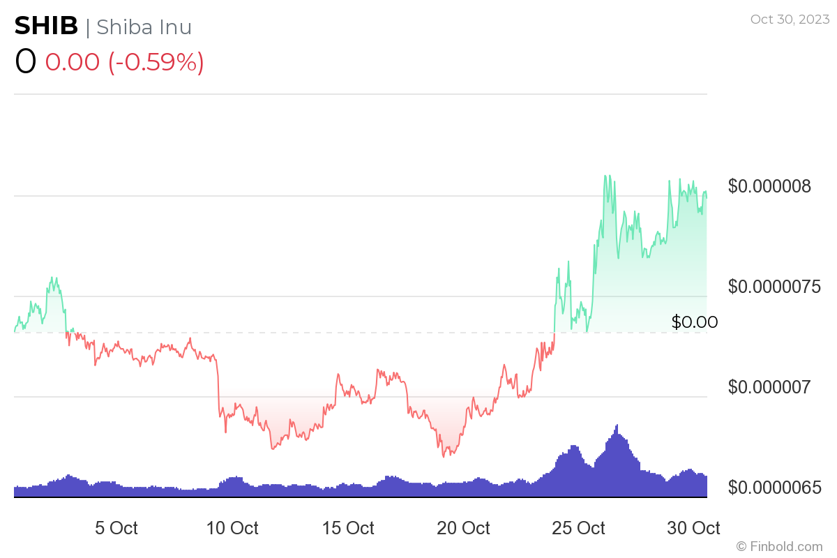 Meanwhile, Shiba Inu was at press time changing hands at the price of $0.000007986, recording a decrease of 0.59% in the last 24 hours, as well as gaining 10.42% across the previous seven days and advancing 8.95% on its monthly chart.