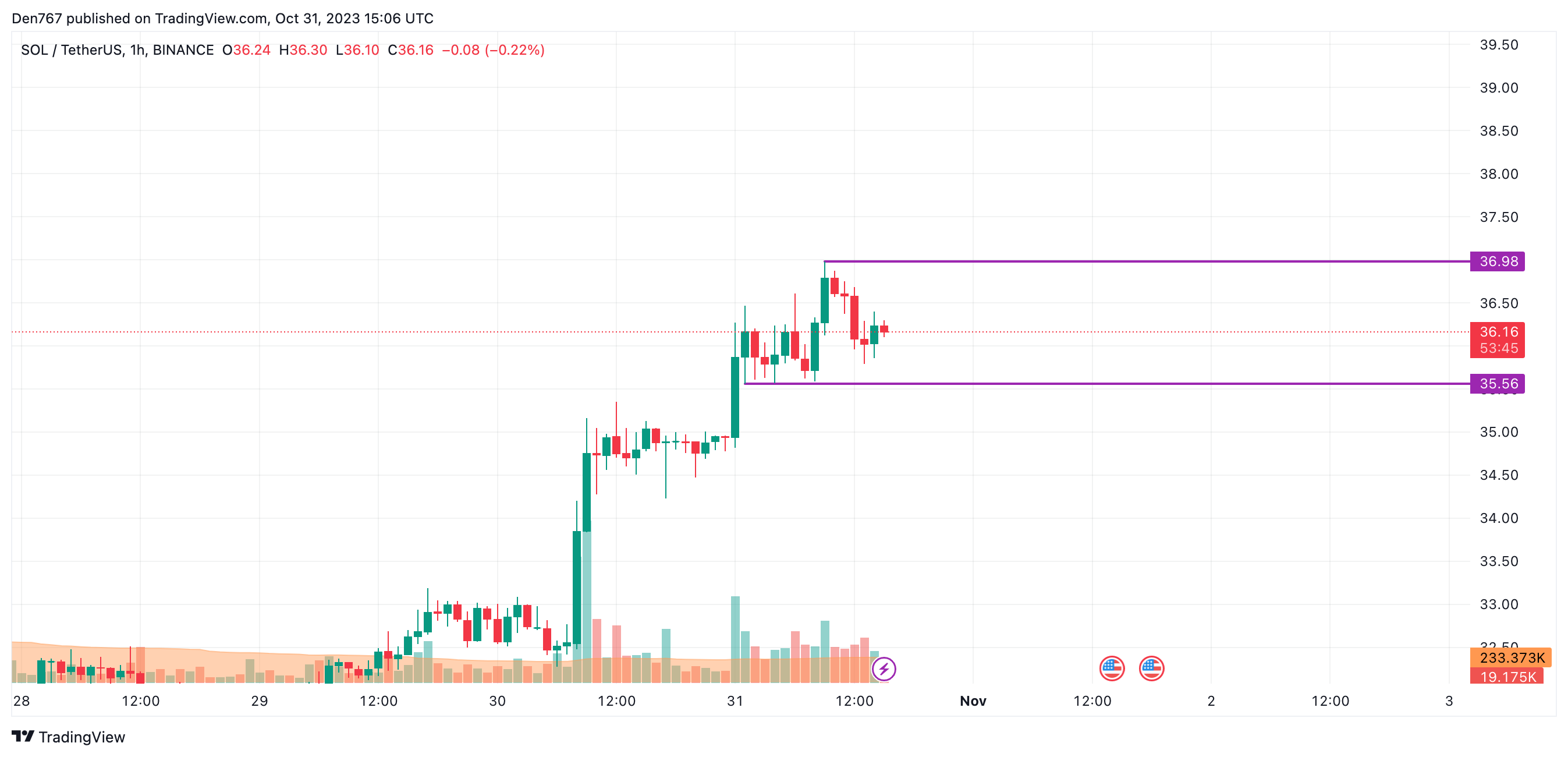 On the hourly time frame, the price of Solana (SOL) has set a local peak at $36.98. If the rise to that mark does not continue by the end of the day, one can expect a decrease to the support of $35.56.