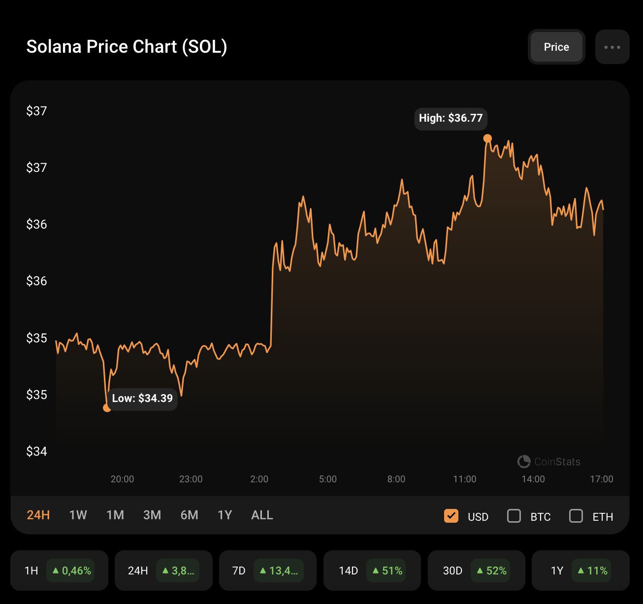 The price of Solana (SOL) has increased by almost 4% since yesterday.