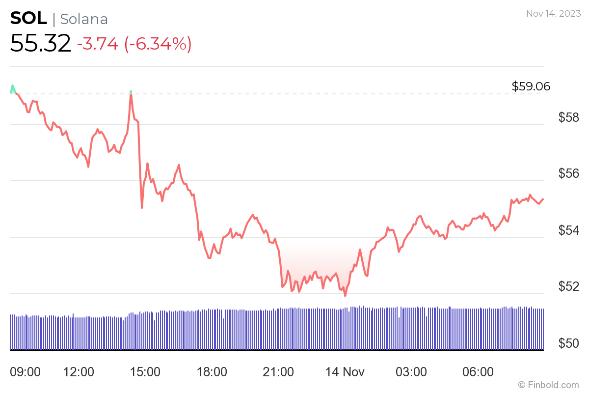The price of Solana experienced a notable drop over the course of the previous 24 hours, falling 6.45% by the time of publication to the price of $55.25. The decline is likely the result of downward pressure caused by another round of selloffs of FTX assets.