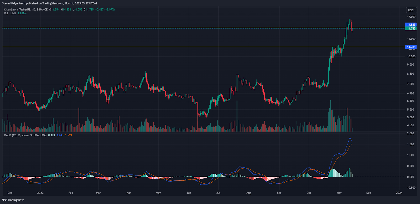 From a technical perspective, LINK dropped below the key $14.825 support level over the past 24 hours. Subsequently, the altcoin was at risk of continuing to drop to the next support level at $11.785 in the following few days.
