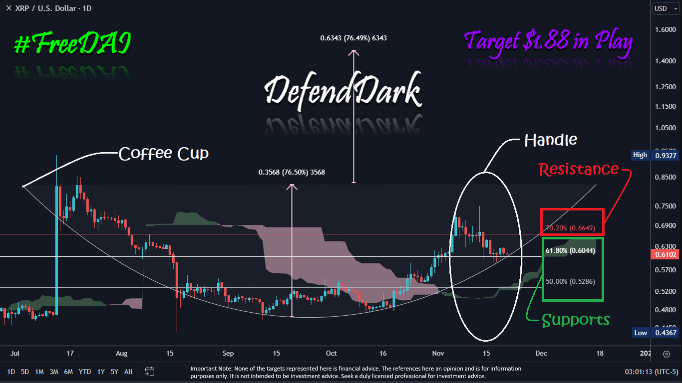 Dark Defender notes, “XRP formed a cup & handle pattern in the daily time frame. We set targets for $1.05 & $1.88 with the Elliott Waves, and now the Cup-Handle pattern is also blinking XRP to reach the targets.”