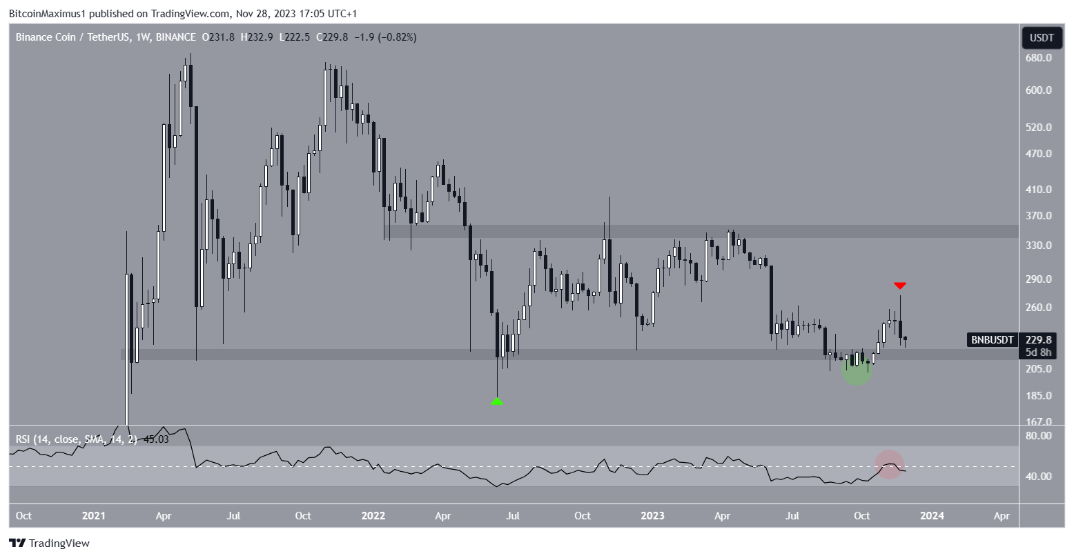 The price initially fell below the area in July 2023 (green circle) but reclaimed the area shortly afterward. The BNB price has increased since.