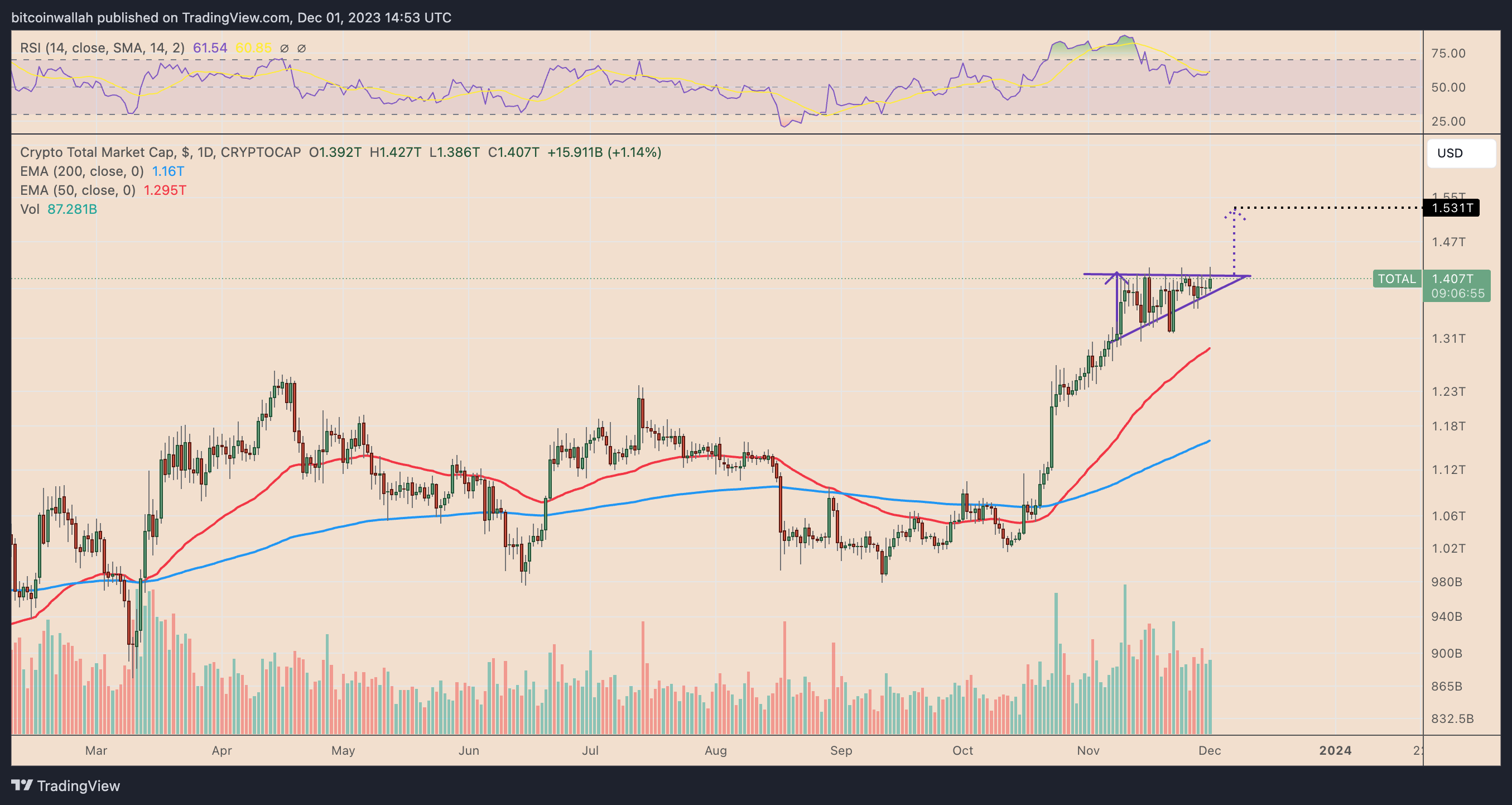 Notably, the market has formed an ascending triangle pattern, which technical analysts consider a bullish continuation pattern in an uptrend. Therefore, the combined valuation of all cryptocurrencies can rise toward $1.5 trillion if it breaks above the triangle's upper trendline in December 2023.
