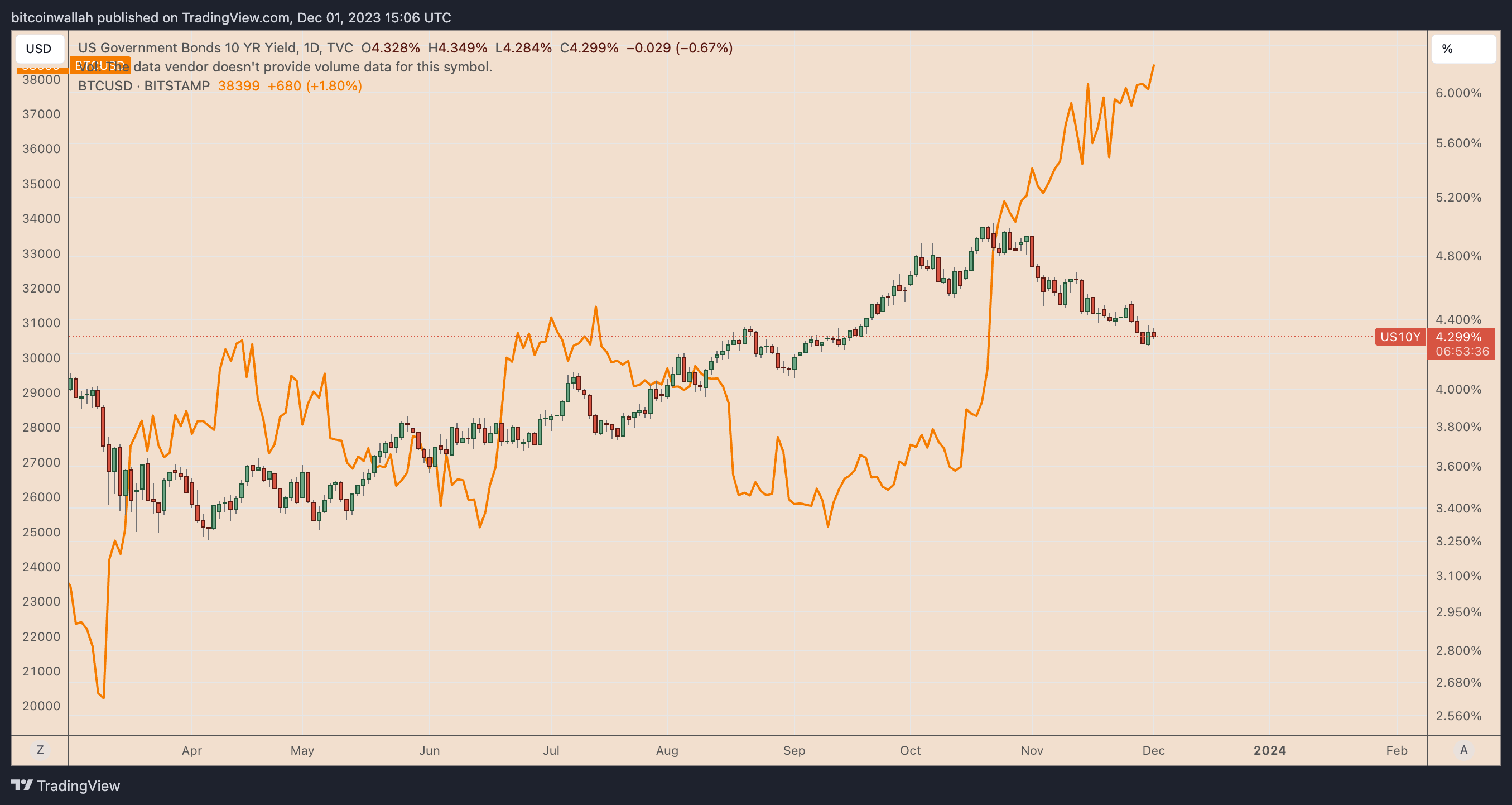 US 10-year bond yield vs. BTC/USD daily performance chart. Source: TradingView