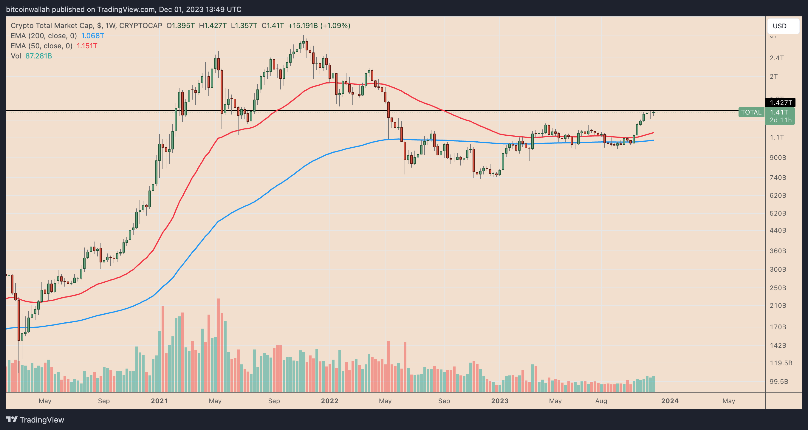 The cryptocurrency market is up today with its net valuation reaching $1.427 trillion for the first time since May 2022.