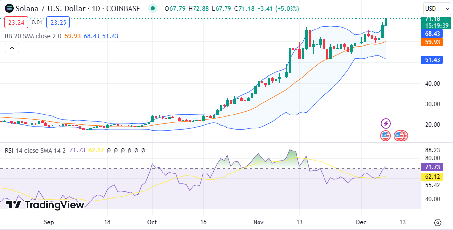 Solana (SOL) is still riding on bull activity, as the Solana price stood at $72.02 as of press time after recording a daily increase of 13% and a weekly rise of 18%. As a result of the Solana price, the token’s trade volume jumped by 76% during the same period and is presently at $4.1B.
