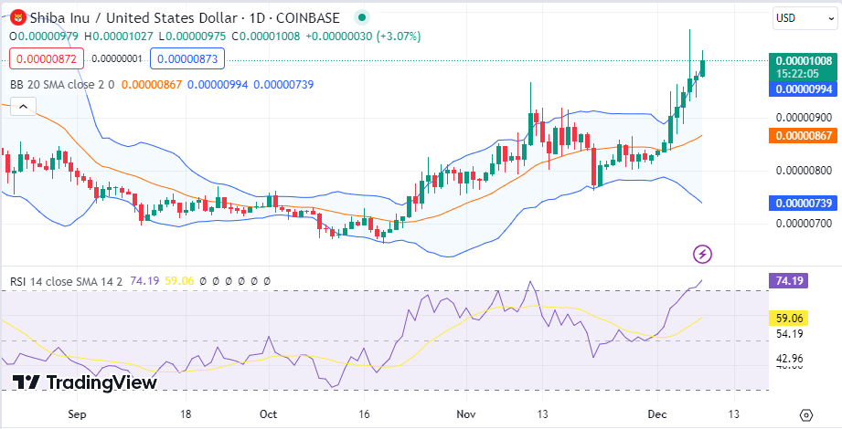 The Bollinger bands are diverging, showing high volatility levels on the Shiba Inu price. The Relative Strength Index (RSI) is above the average line in the overbought region, showing bull dominance on the Shiba Inu price.