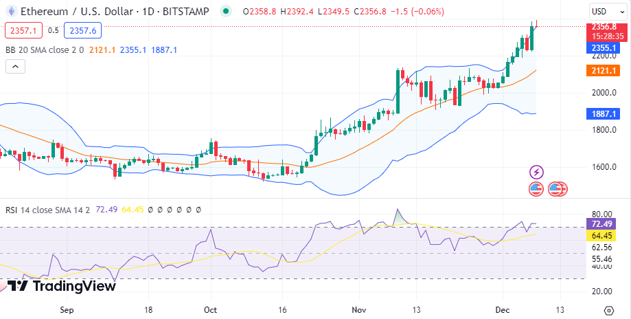 Ethereum (ETH) is still riding on bull activity, as the Ethereum price stood at $2,356 as of press time after recording a daily decrease of 4.6% and a weekly rise of 12.5%. As a result of the Ethereum price, the token’s trade volume jumped by 44% during the same period and is presently at $16.1B.