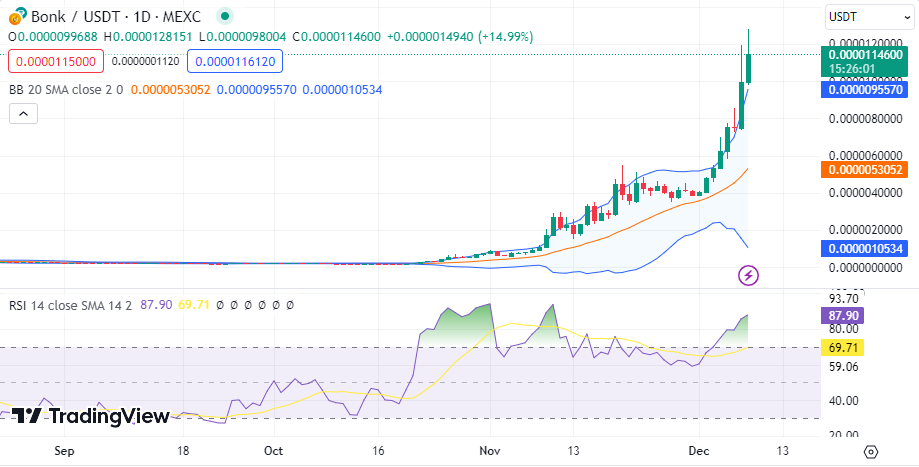 The Bollinger bands are diverging, showing high volatility levels on the Bonk price. The Relative Strength Index (RSI) is above the average line in the overbought region, showing bull dominance on the Bonk price.