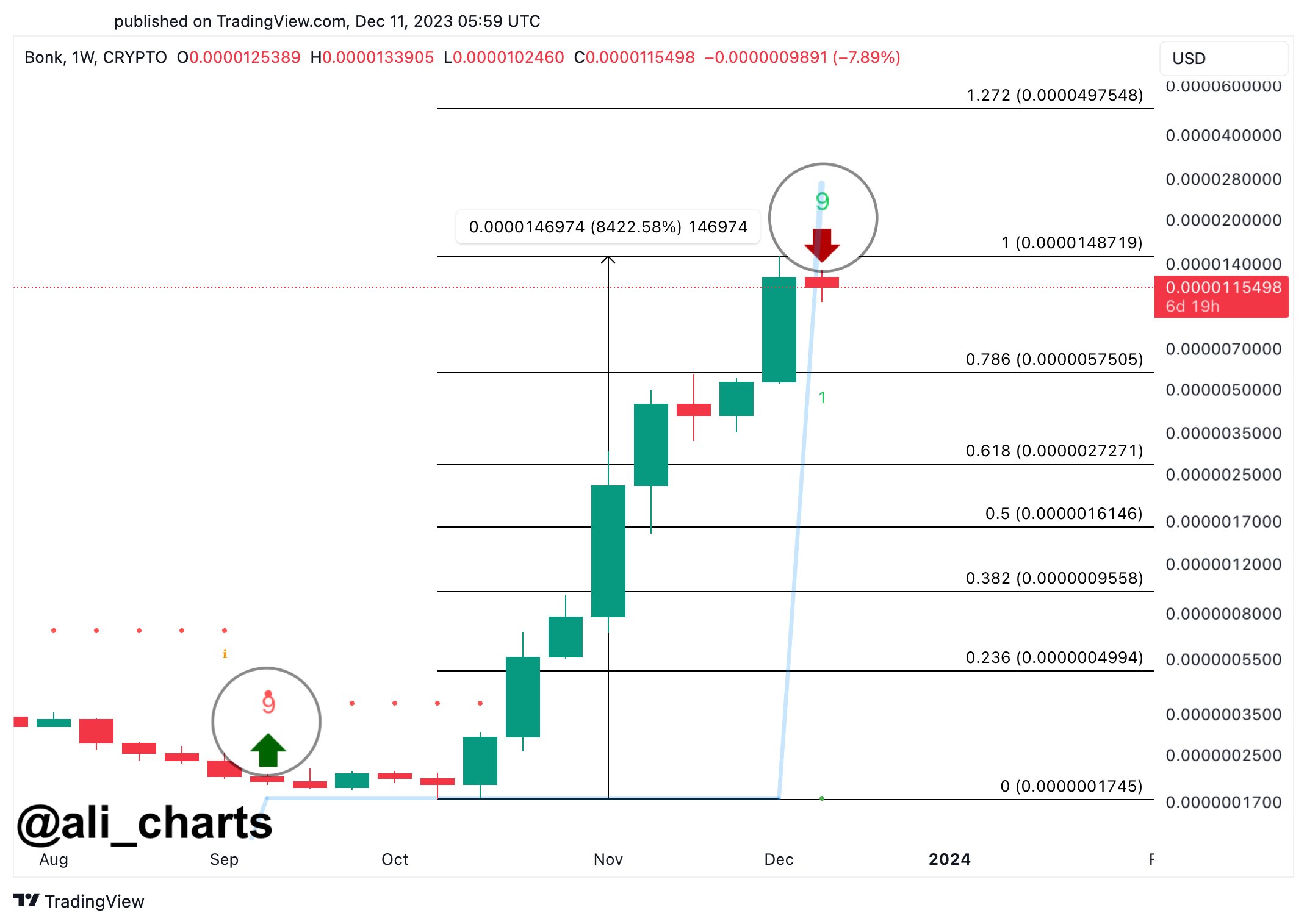 A TD Sequential setup has been completed for memecoin BONK on its weekly price chart just recently. Here is the chart shared by the analyst that shows this pattern in the cryptocurrency: