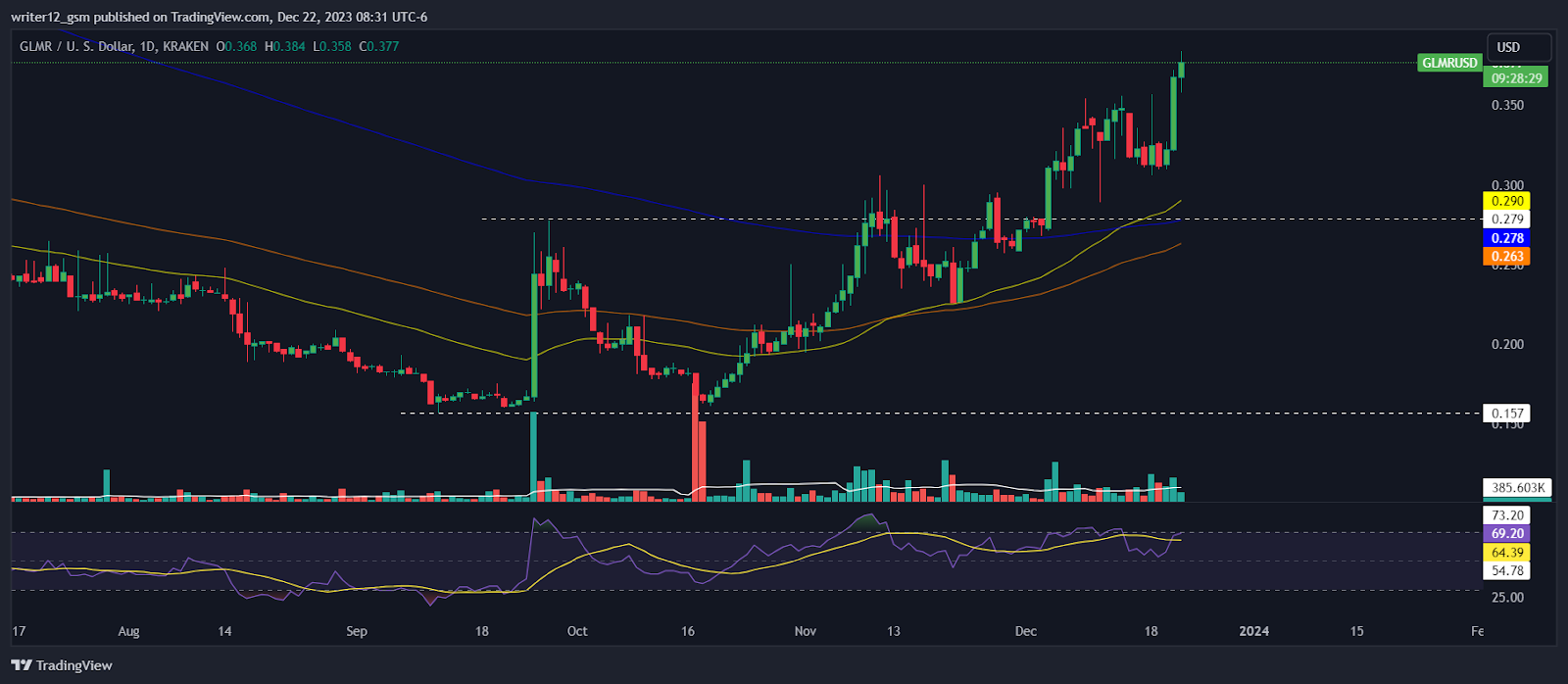 Currently, Moonbeam crypto (USD: GLMR) is trading above the 50 and 200-day daily moving averages (DMAs).